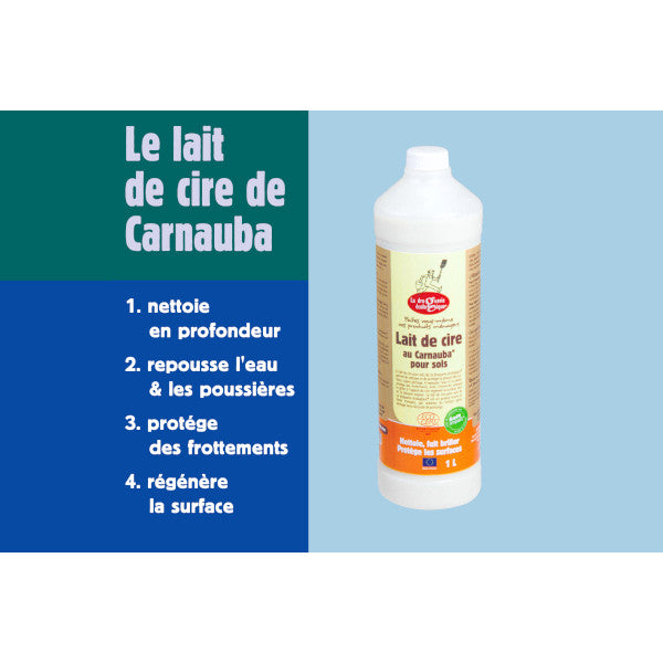 Le lait de cire au Carnauba pour sols est efficace pour le nettoyage et l’entretien de la plupart des surfaces. Il peut s’utiliser sur la plupart des surfaces comme: les planchers en bois huilés ou cirés, le liège, le linoléum, les tomettes, la terre cuite, les ardoises, le marbre, les escaliers, les plans de travail, les bétons cirés, etc. Découvrons ensemble tous les avantages de ce produit.