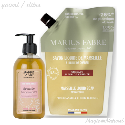 Marius FabreSavon liquide de Marseille à la fleur de cerisier et grenade pour les mains, le corps et le visage, disponible en flacon pompe 400 ml et en éco-rec...